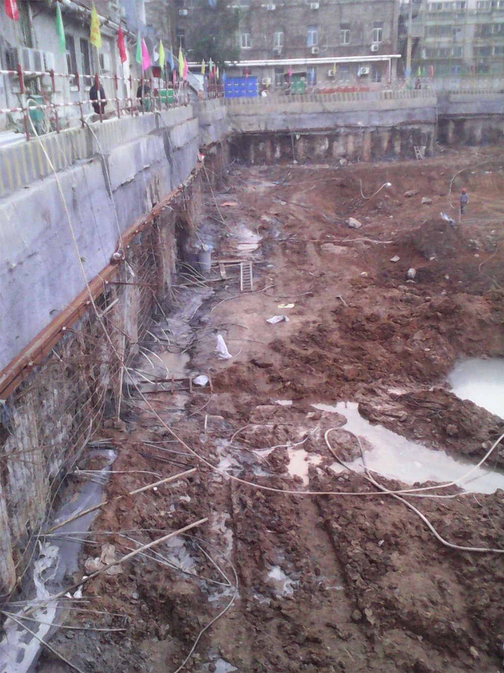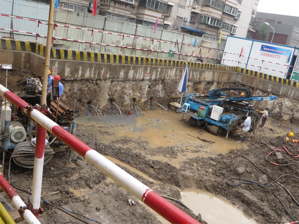 项目简介:拟建综合楼设计地上4层、地下2层,基坑开挖长84.42m、宽43.29m,基础挖深9.3m,拟采用框架结构、筏板或独立基础。该基坑设计采用桩锚支护、高压旋喷帷幕止水方式,施工主要内容为支护桩施工、高压旋喷施工、冠梁施工、锚索施工、降水施工、挂网喷面等工作。共分为四个支护单元(2-2、3-3、4-4剖面按一级,1-1剖面按二级),为临时结构,使用期限为12个月。场地地下水埋深较浅,地下水较丰富。